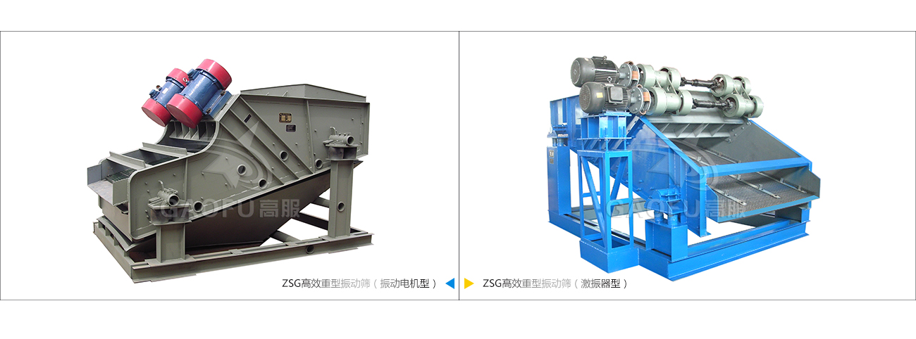 ZSG型重型振動篩的基本工作原理為,篩機起動后,呈對稱布置的兩臺相同型號和規格的振動電機或激振器作同步反向運轉,其產生的激振力通過傳振體—電機或激振器底座傳遞到整個振動體—篩箱上,使篩箱帶動篩面作周期性振動,從而使篩面上的物料隨篩箱一同作定向跳躍式運動,其間,小于篩面孔徑的物料通過篩孔落到下層,成為篩下物,大于篩面孔徑的物料經連續跳躍運動后從排料口排出,完成篩分作業。