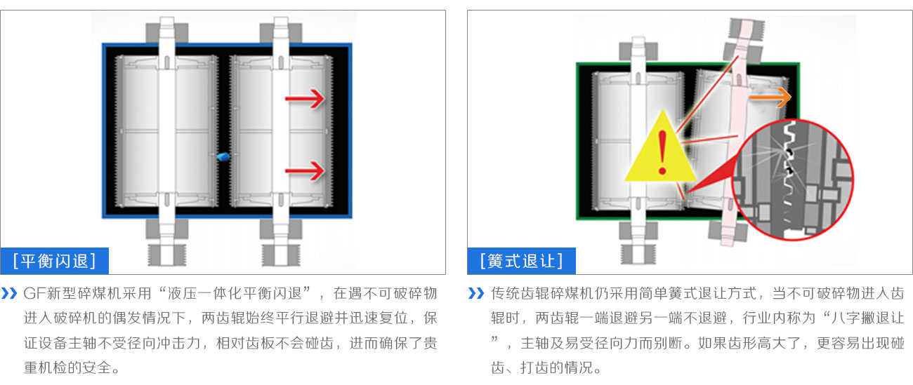 | ?環保節能效率高:進料≤50mm,出料≤10mm之間可調,一次破碎比可達50。GF破碎機能耗具有儲備和釋放動能的作用。相比同等出力錘式破碎機能耗只有不到1/2,經濟效益可觀。小于0.3mm的振幅,低于70分貝的噪音,微正壓全密封的結構形式,降低了工作現場的“三害”現象,減少職工矽肺病的發生,是一款符合環保標準的產品。 | 液簧平衡閃退保護:采用創新齒形,工作部件齒板采用燕尾連接結構,連接可靠。我公司針對當前煤種來源不固定,雜物較多的情況開發了自動退讓式破碎機產品。當木塊及其它非磁性合金或橡膠等柔性物體進入破碎機無法破碎時,兩齒輥能自動平行退讓,讓開上述物料,隨后又迅速恢復到原調好的間隙位置,保持連續運行。 | |