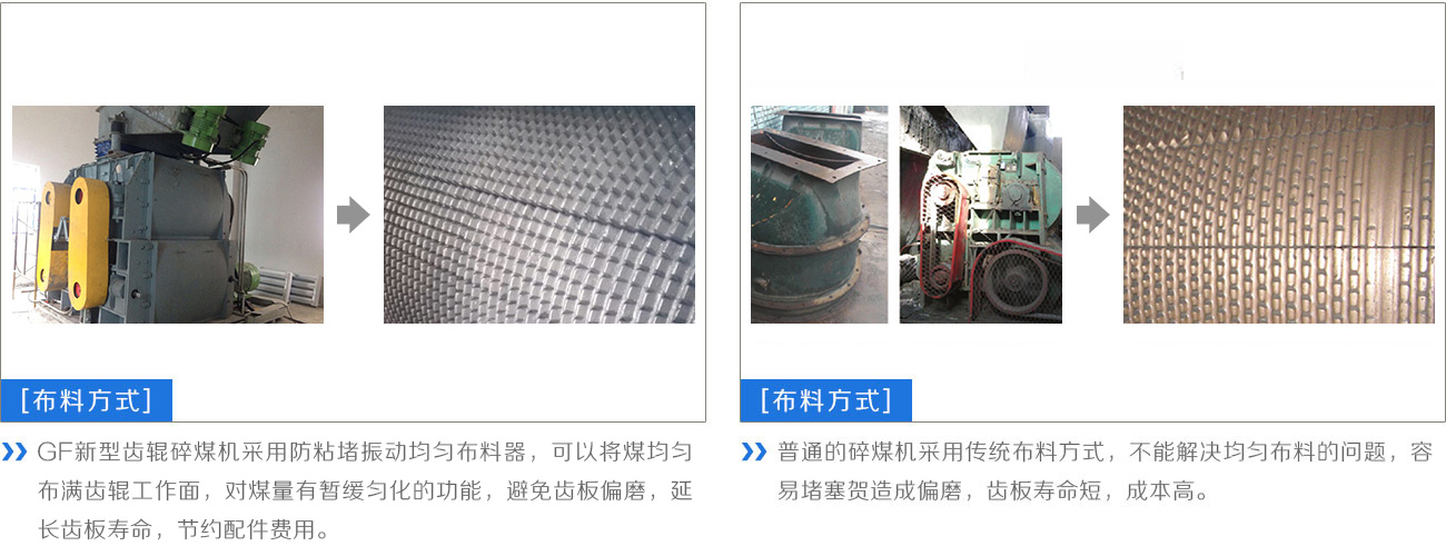 | GF新型齒輥碎煤機相對兩輥之間為差速運轉,可以相互清理齒縫間物料,從而減少粘堵現象! | 環錘破碎機相對燃料水分要求高,如水分超過6%則篩板出現粘堵,隨之產能大幅降低,如水分達到10%左右,則產能會降低至額定產能的1/3。 |