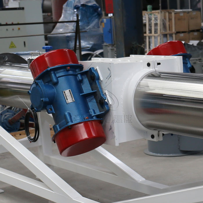 振動(dòng)給料機(jī)的基本工作原理為,設(shè)備起動(dòng)后,呈對(duì)稱布置的兩臺(tái)相同型號(hào)和規(guī)格的振動(dòng)電機(jī)或激振器作同步反向運(yùn)轉(zhuǎn),其產(chǎn)生的激振力通過傳振體—電機(jī)或激振器底座傳遞到整個(gè)振動(dòng)體—給料槽上,使料槽作周期性振動(dòng),從而使料槽內(nèi)的物料隨之一同向排料端作定向跳躍式運(yùn)動(dòng),完成物料的輸送作業(yè)。