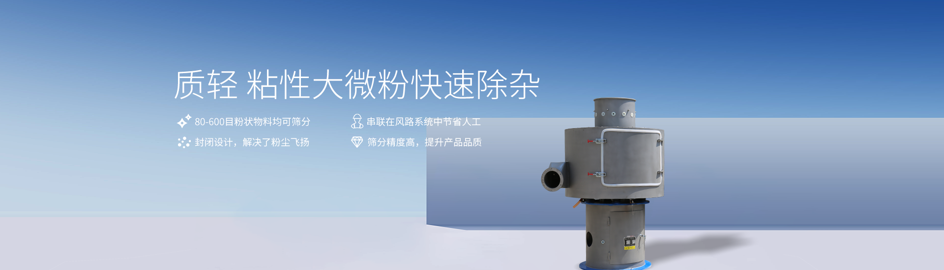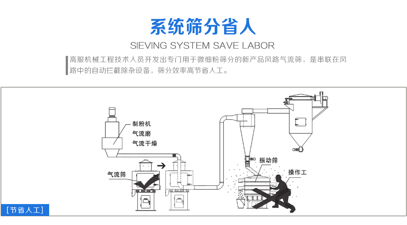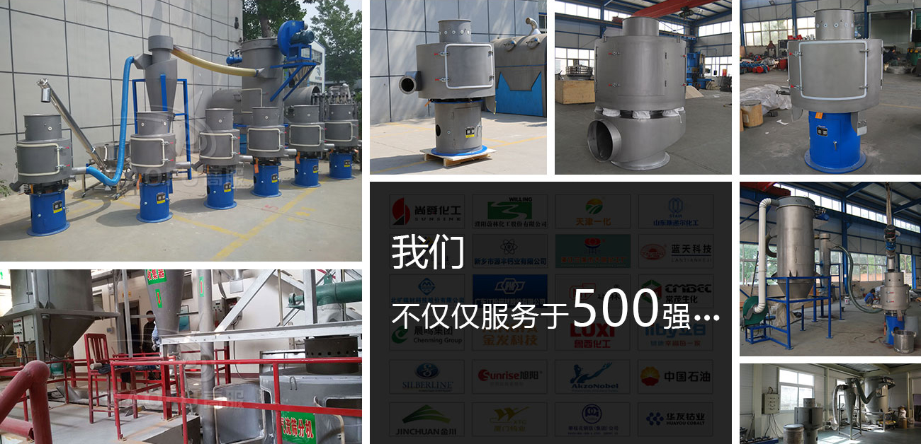 風路氣流篩是串聯在風路中的自動攔截除雜設備。其原理是它串聯在原料生產的風路中,原料混合體從氣流篩入口進入機體,通過智能渦輪加力,使原料分散成單體并向復合篩網有序通過,順風路方向進入下道工序。不合格的雜質異物被攔截下來,通過自動排渣口自動排出。從而完成了有網作業的挑選過程。利用氣流霧化將原料分散成單體,克服了物料的粘黏、團聚、靜電吸附、質輕漂浮、有結塊等很難篩分的特性,實現了傳統篩分機械無法有效篩分的目的。它是一種綜合利用了離心力、風力、氣體渦流、機械動能、重力勢能及振動力等智能化篩分設備。