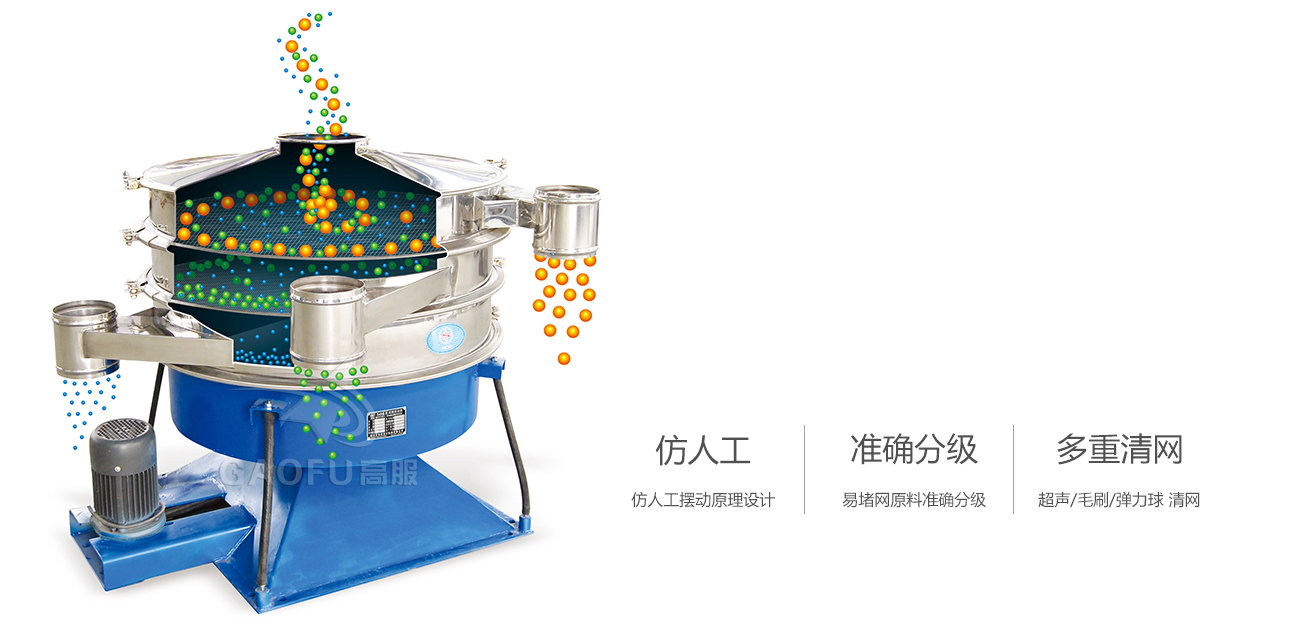 搖擺篩是一種仿人工搖動(dòng)的低頻旋振篩,其原理是:瞬時(shí)運(yùn)動(dòng)為沿徑向的位移和以此位移為軸的圓周運(yùn)動(dòng)的合成(螺旋運(yùn)動(dòng)),即可調(diào)節(jié)偏心距的激振器產(chǎn)生了非線性三維運(yùn)動(dòng),物料也產(chǎn)生同樣的近似手動(dòng)作業(yè)的運(yùn)動(dòng),從而達(dá)到篩分之目的,再配合篩分附件可獲得更加理想的篩分效果適合于圓形狀、圓柱狀、片狀、乃至 于規(guī)則形狀易堵網(wǎng)且需要精細(xì)篩分的物料。